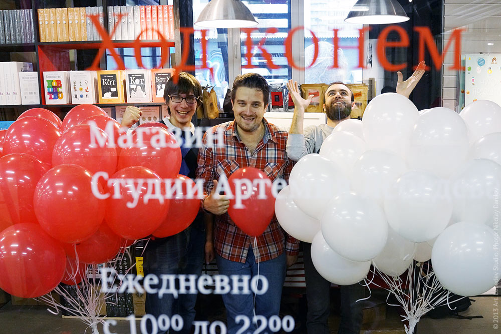![]() New studio store Khod Konyom opened on the territory of Flacon Design Factory in Moscow. Pictured: sales assistants Sergey Parkhomenko, Ivan Kudryavtsev and Ivan Safin are happy.