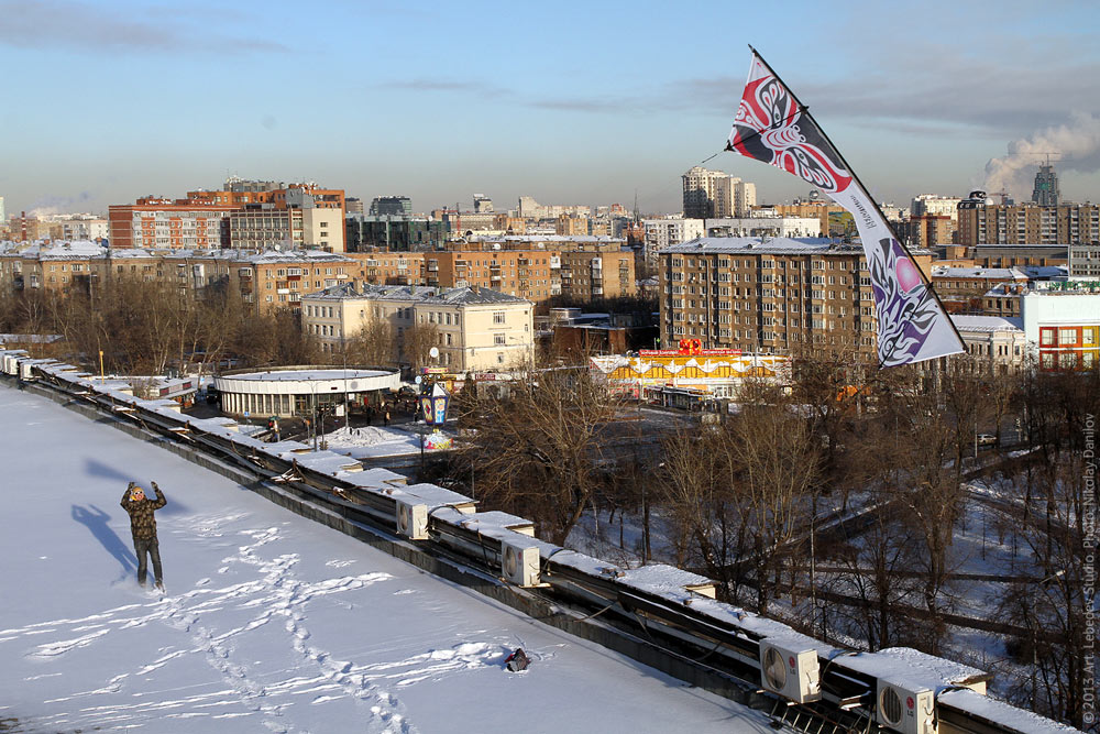 Art director Timur Burbayev launches a four line kite from the top of the studio building.