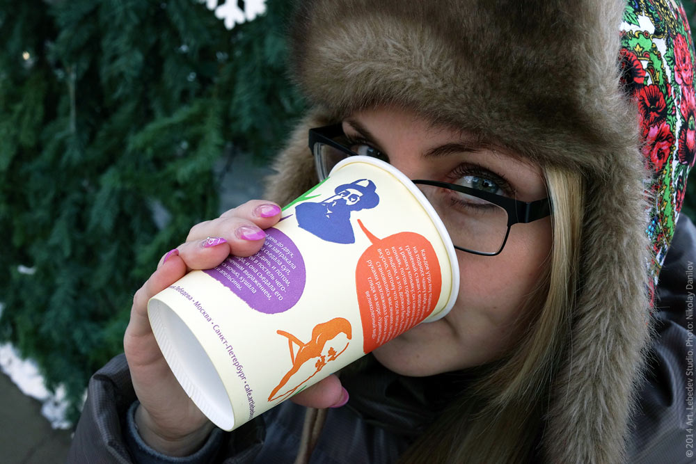 ![]() Take away coffee in studio cafés is again sold in paper cups with coffee-related quotations from classic works of Russian writers.