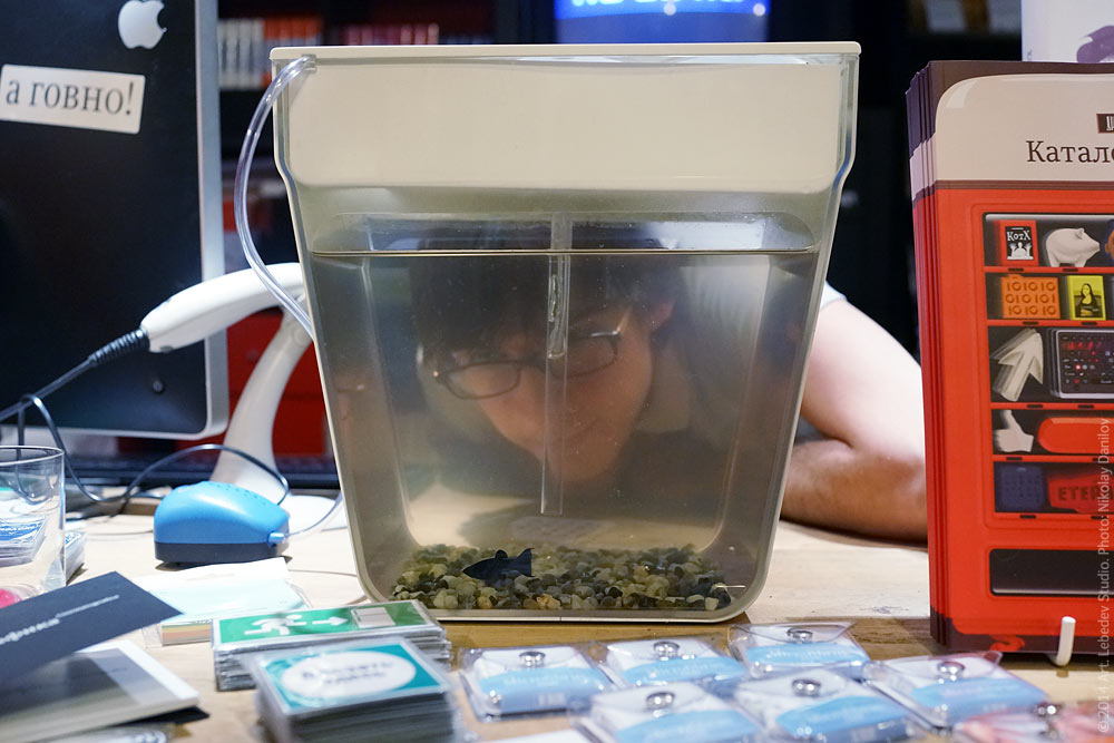 ![]() Sales assistant Sergey Parkhomenko examines Aquafarm, a closed ecosystem based on the ancient Aztec method of agriculture.