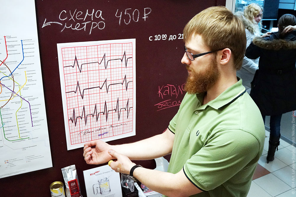 Kirill Kryukov, salesman, decorates the Dreams Realization Point with the Valentine’s Day poster.