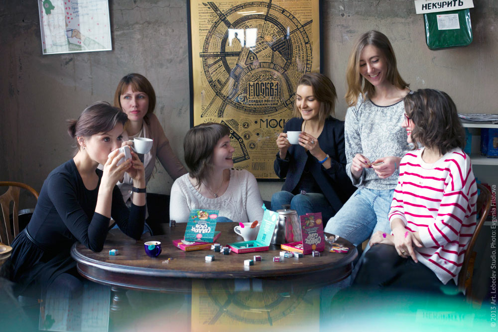 ![]() Left to right: project manager Natalya Moskalyova, type designer Taisia Lushenko, typesetter Anna Golovina, photographer Evgenia Filatova, type designer Ksenia Erulevich and designer Darya Anikeeva enjoy tea with the Sweet Words chocolate.