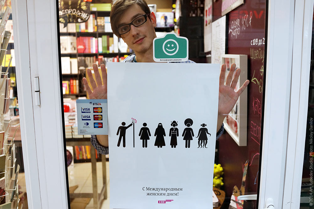 Intern salesman Aleksey Igoshin decorates the Dreams Realization Point with an International Women’s Day poster