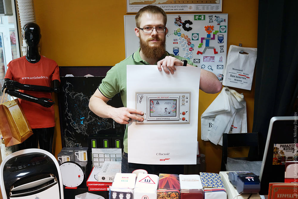 Sales assistant Kirill Kryukov is getting ready to decorate the Dreams Realization Point with an Easter poster.