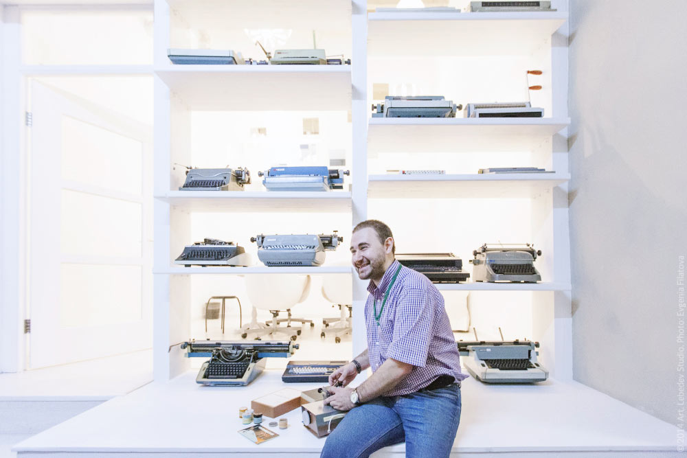 ![]() Head of the Project Management Department of the State Russian Library for Youth Anton Purnik with a 1968 filmstrip projector F-68 that the library gifted to the studio’s Museum of Oldies.