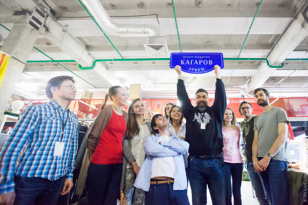 Studio employees celebrate the birthday of art director Erken Kagarov and present him with a personalized house plate.