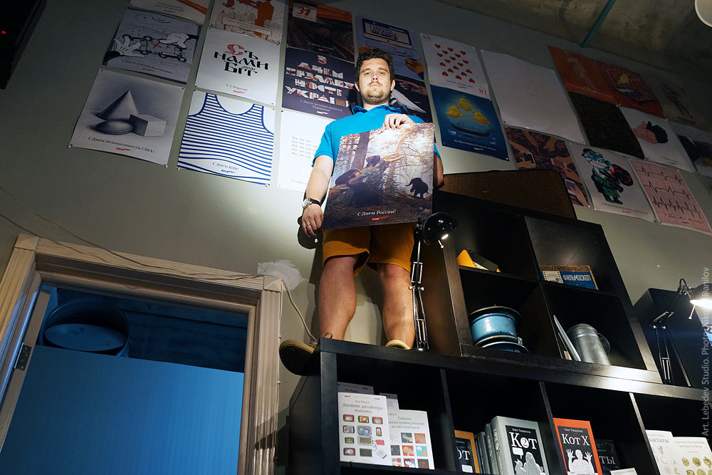 Sales assistant Ivan Kudriavtsev decorates the Binom Nyutona store with the Russia Day poster.