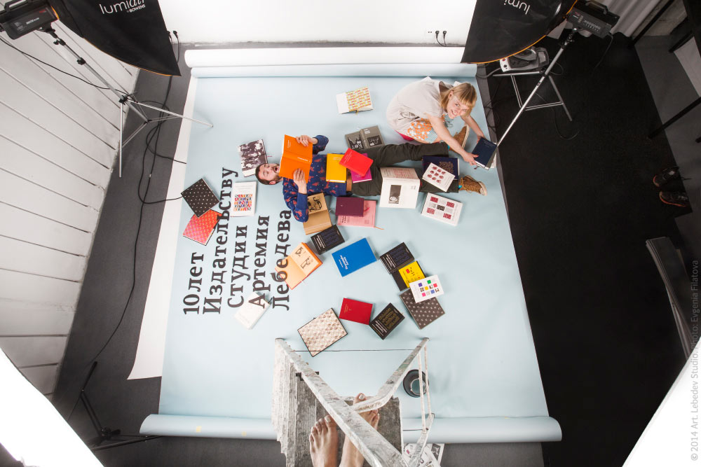 ![]() Project manager Alexey Luri and designer Natasha Baiduzha at the photo shoot for the Art. Lebedev Studio Publishing House tenth anniversary poster.