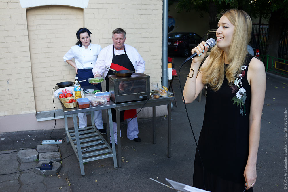 Terrace of the studio café on Bolshaya Nikitskaya: chef Tatyana Panteleeva, chef Kakha Eshba and signer Ksenia Larusso entertain guests with hamburgers and singing.