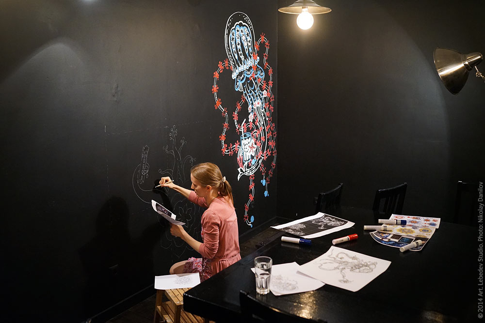 Illustrator Lizaveta Romantsova decorates a wall in the studio's Store and Big Café.