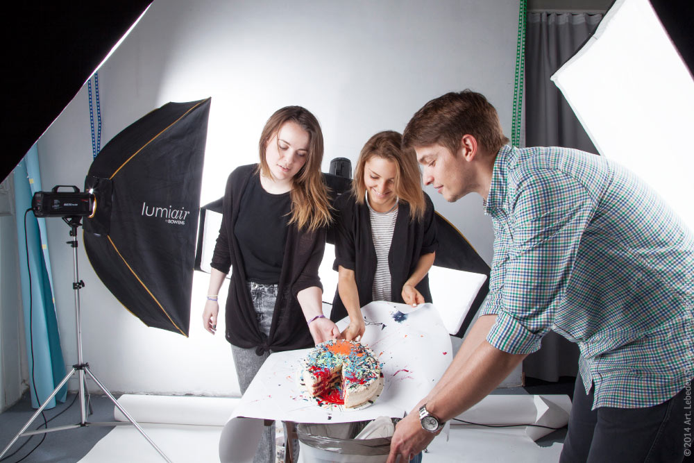 ![]() Manager Olga Kallaur, photographer Yevgenia Filatova and designer Ivan Olenkevich prepare a cake for a photo shoot for the Year of Culture in Moscow advertising campaign.