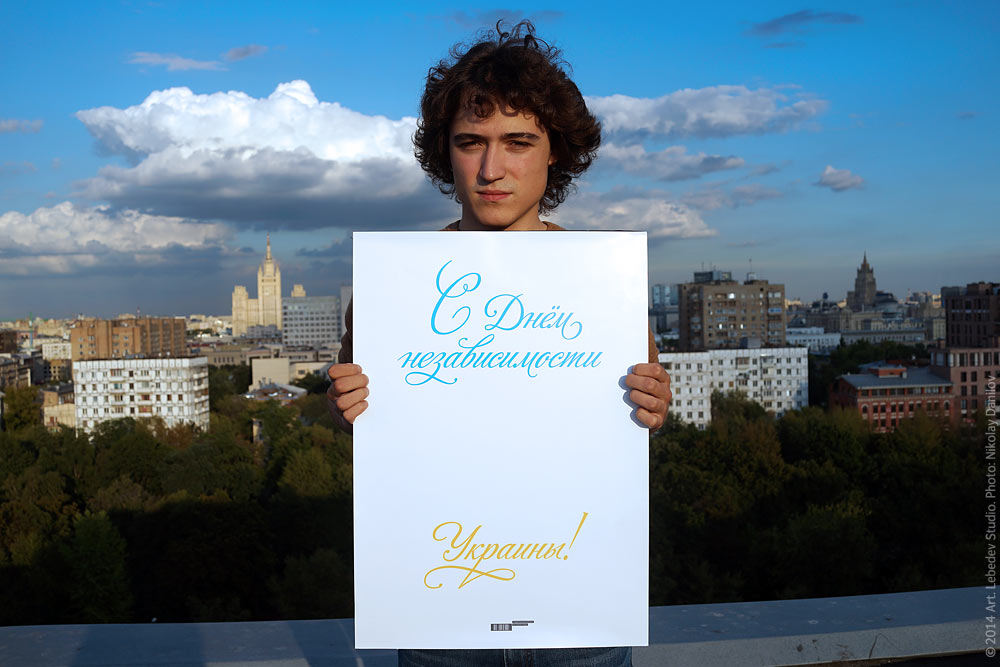 ![]() Project manager Vsevolod Chagaev holding a one-man picket on the roof of the studio with the Independence Day of Ukraine poster.