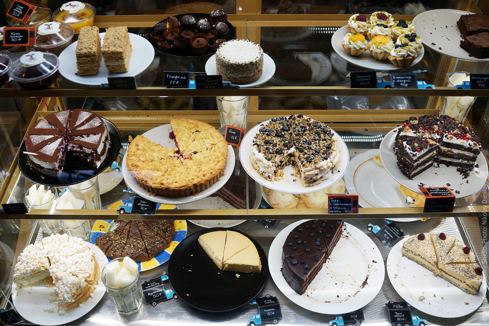 The choice of cakes in the café on the seventh floor of the studio.