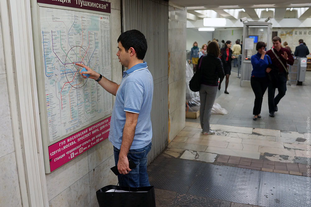 ![]() Entrance to Pushkinskaya and Tverskaya metro stations: a passenger studies the new official Moscow Metro map for stations.