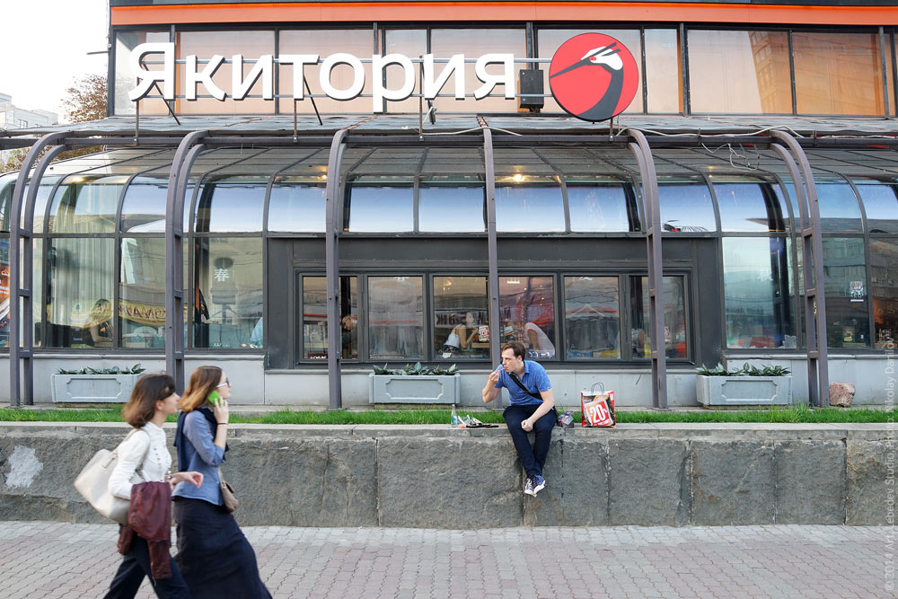 Designer Egor Zhgun having his lunch under the new Yakitoriya logo.
