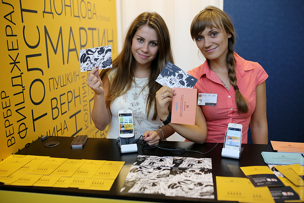 27th International Moscow Book Fair: Mybook.ru digital library postcards at the library's booth.