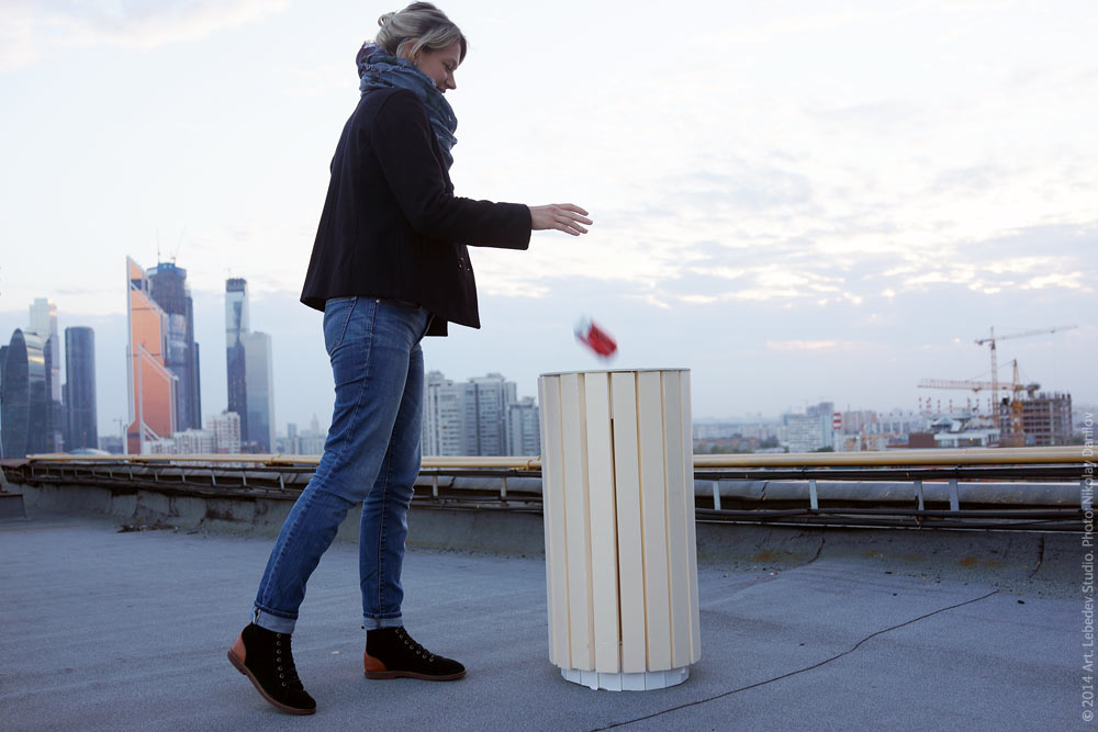 Designer Sofia Solomko and a mock-up of the Urnus-7 street trash can on the roof of the studio's building.