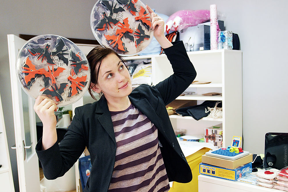 Riga (Latvia): Baiba Krodziniece, expert of the Mojo-Jojo! gift store tries on Vespertilium clothes pegs.