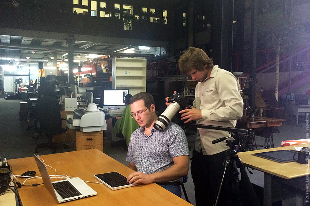 ![]() Programmer Grigory Odegov and guest cameraman Mikhalis Ovchinnikov shoot a video about the Optimus Popularis keyboard.