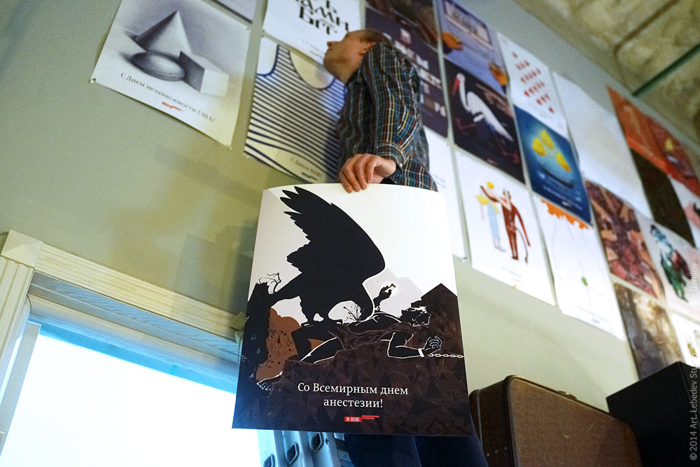 Sales assistant Yegor Gorshkov decorates the Binom Nyutona store with the World Anaesthesia Day poster.