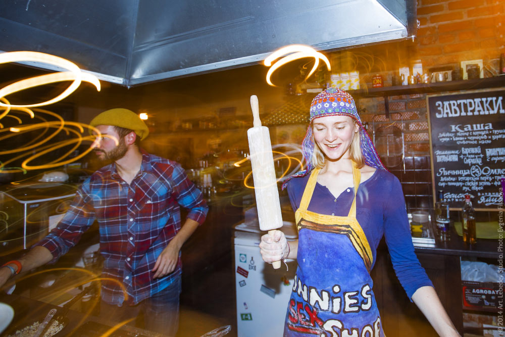 Manager Alexey Luri and designer Natasha Baiduzha make flapjacks in the café on the seventh floor of the studio.