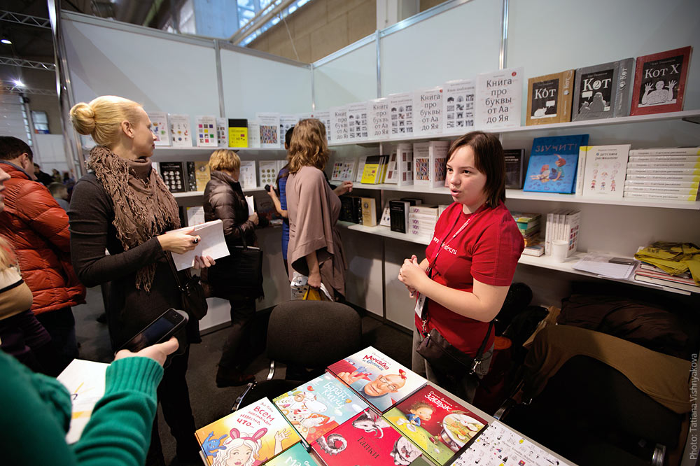 8th Krasnoyarsk Book Culture Fair: sales manager Anna Samsonova greets visitors at the studio's booth.