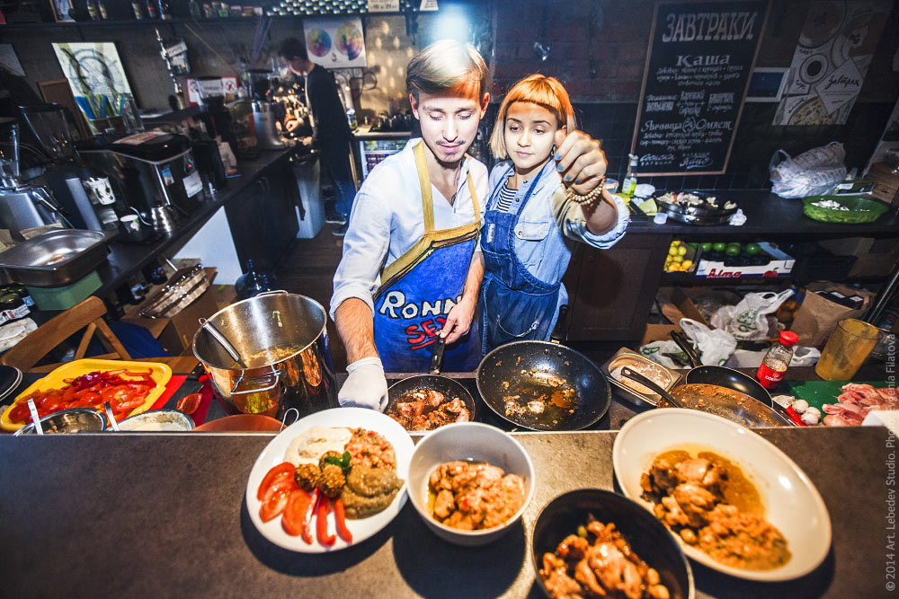 ![]() On Wednesdays specially invited guest chefs cook lunches for studio employees in the café on the seventh floor of the studio. Pictured: Nikita Kitin and Snezhana Davidova make vegeterian meze, chimtak and thukpa soup.