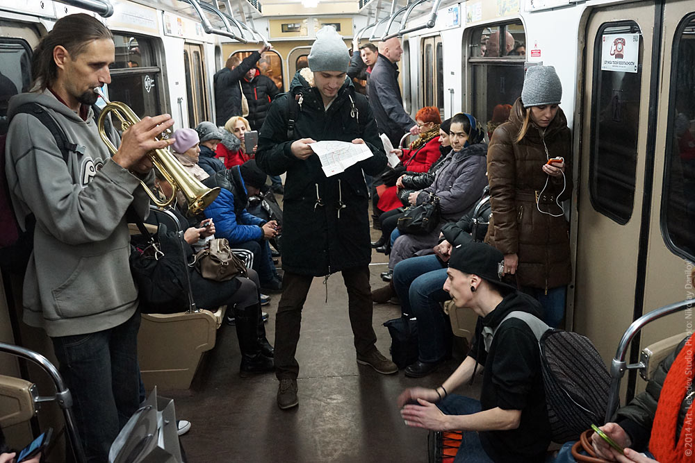 Designer Mark Rodionov (center) studies the Moscow Metro pocket map 2.0 while riding the Moscow Metro.