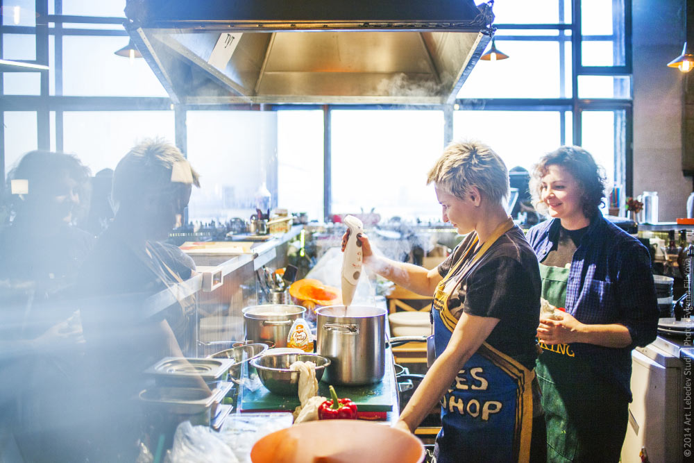 ![]() On Wednesdays specially invited guest chefs cook lunches for studio employees in the café on the seventh floor of the studio. Pictured: Olga Kulikova, managing partner of Artikul Media group (left), and head of SMM and content marketing department Elena Kupriyanova make a cucumber and tomato salad, pumpkin soup with prawns, chicken liver in honey and orange sauce, baked salmon and avocado mashed potatoes.