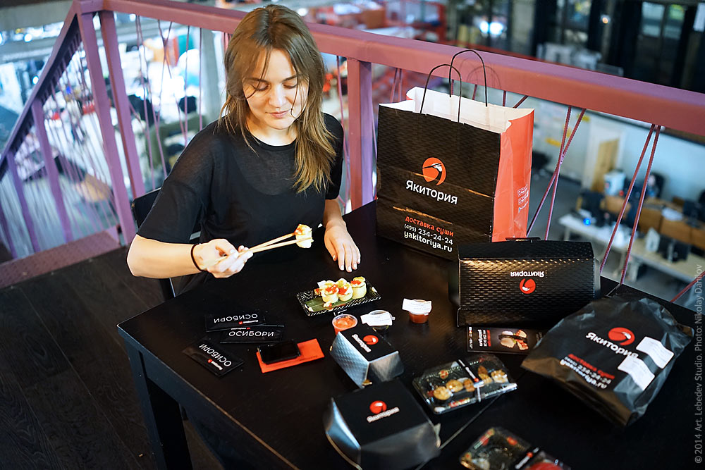 Manager Olga Kallaur studies the packaging of takeaway delivered from Yakitoriya restaurant.