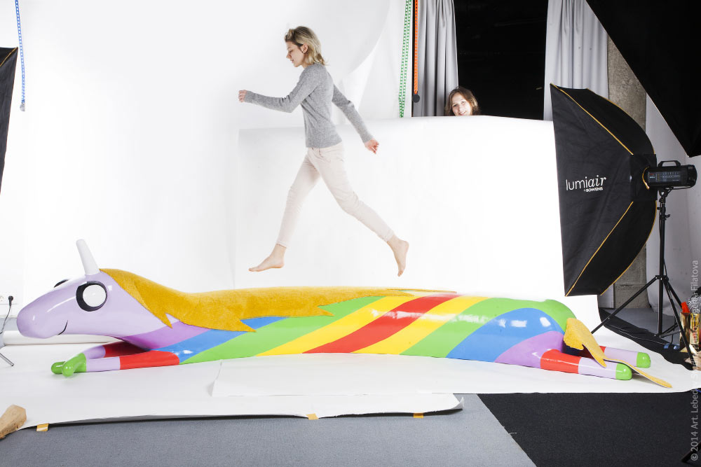 ![]() Designer Sofia Solomko (left) and manager Anna Frolova at a photo shoot of a bench modeled after Lady Rainicorn, a character in Adventure Time animated series.