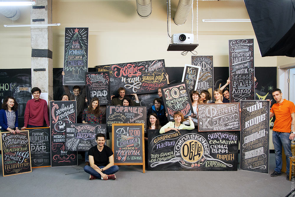 ![]() Graphic and type designer Igor Mustayev (front center) conducted a master class «Lettering. Chalk as an instrument» at the studio. Studio employees with their works (left to right): designer Olga Konovalova, intern Alexander Bogatov, typesetter Yaroslav Bondarenko, designer Ivan Olenkevich, designer Tatyana Buchneva, designer Mark Rodionov, coder Alena Malashenko, designer Lyudmila Lyalina, designer Vasily Dubovoy, manager Dmitry Loginov, type designer Taisiya Lushenko, typesetter Anna Golovina, manager Yulia Nikolaeva, type designer Ksenia Yerulevich, chief typesetter Iskander Mukhamadeyev, designer Dmitry Lamonov. |