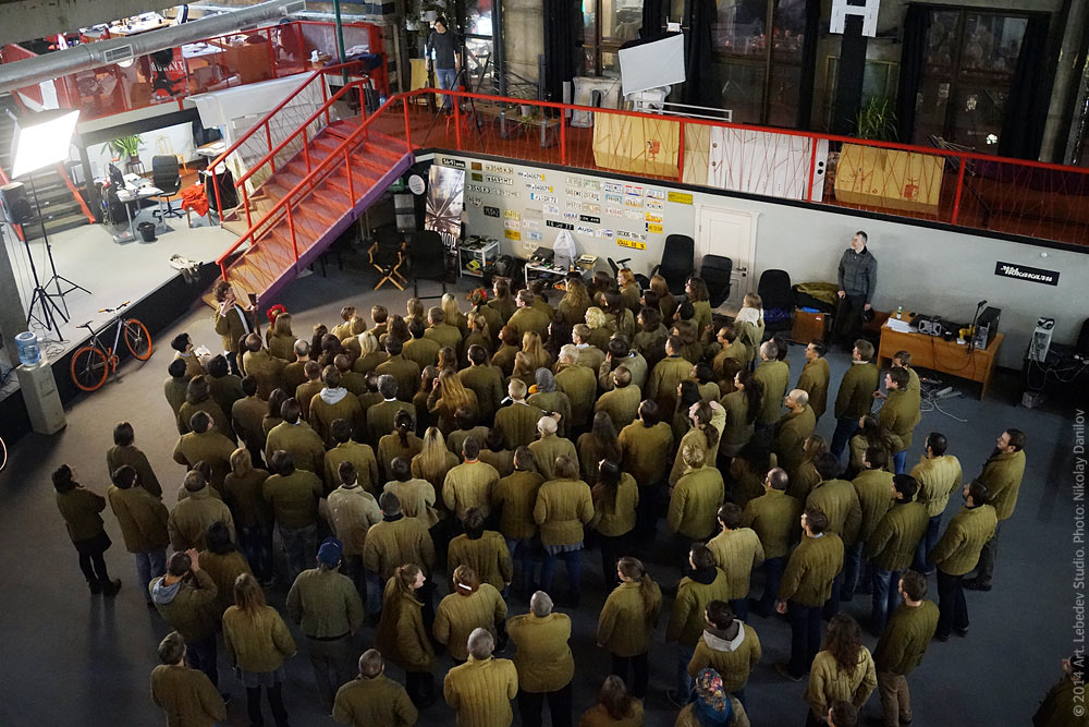 Studio employees wearing traditional Russian quilted jackets are preparing for the December studio photo.