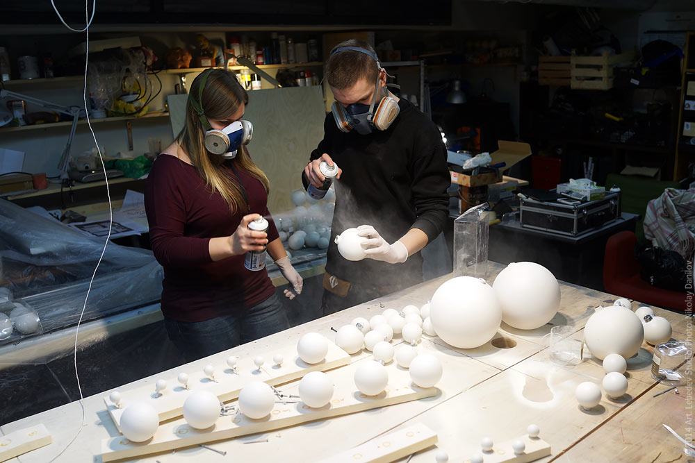 Office manager Maria Komarova and courier Vitaly Kochetkov repaint Christmas balls for decoration of the studio’s coffee points.