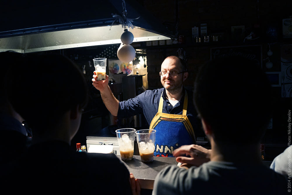 Art director Ludwig Bystronovsky behind the bar during the New Year party at the studio.