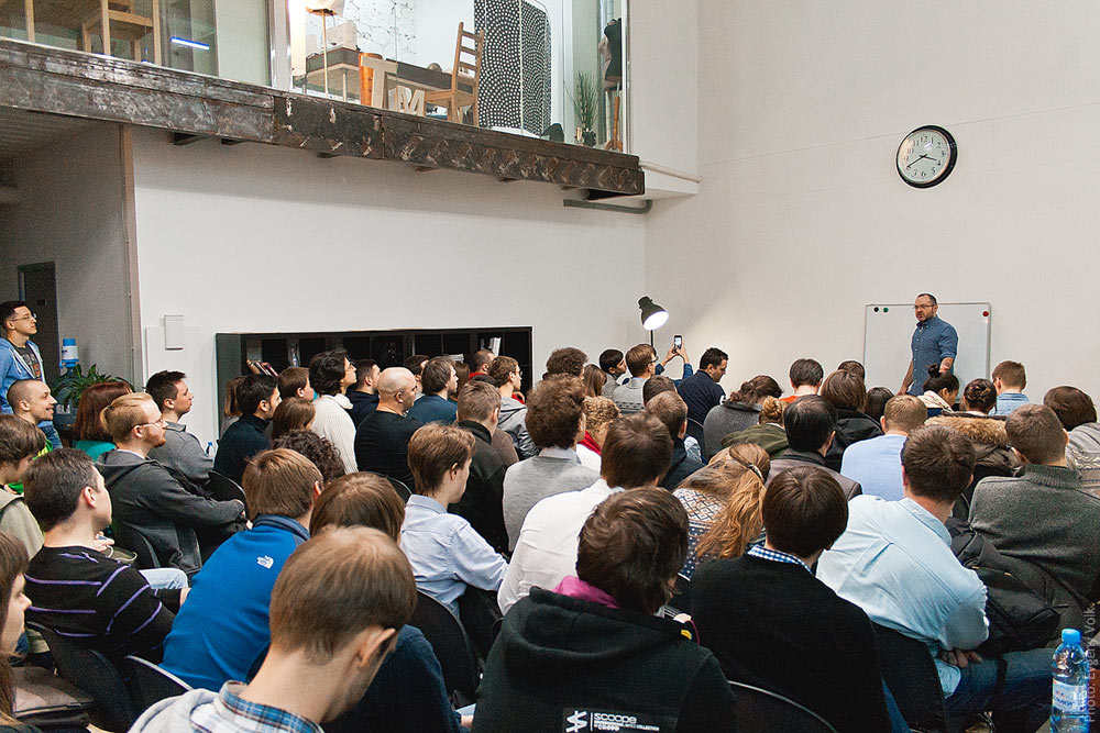 Studio’s art director Ludwig Bystronovsky gives a lecture at Akademiya Na Fabrike Workplace.