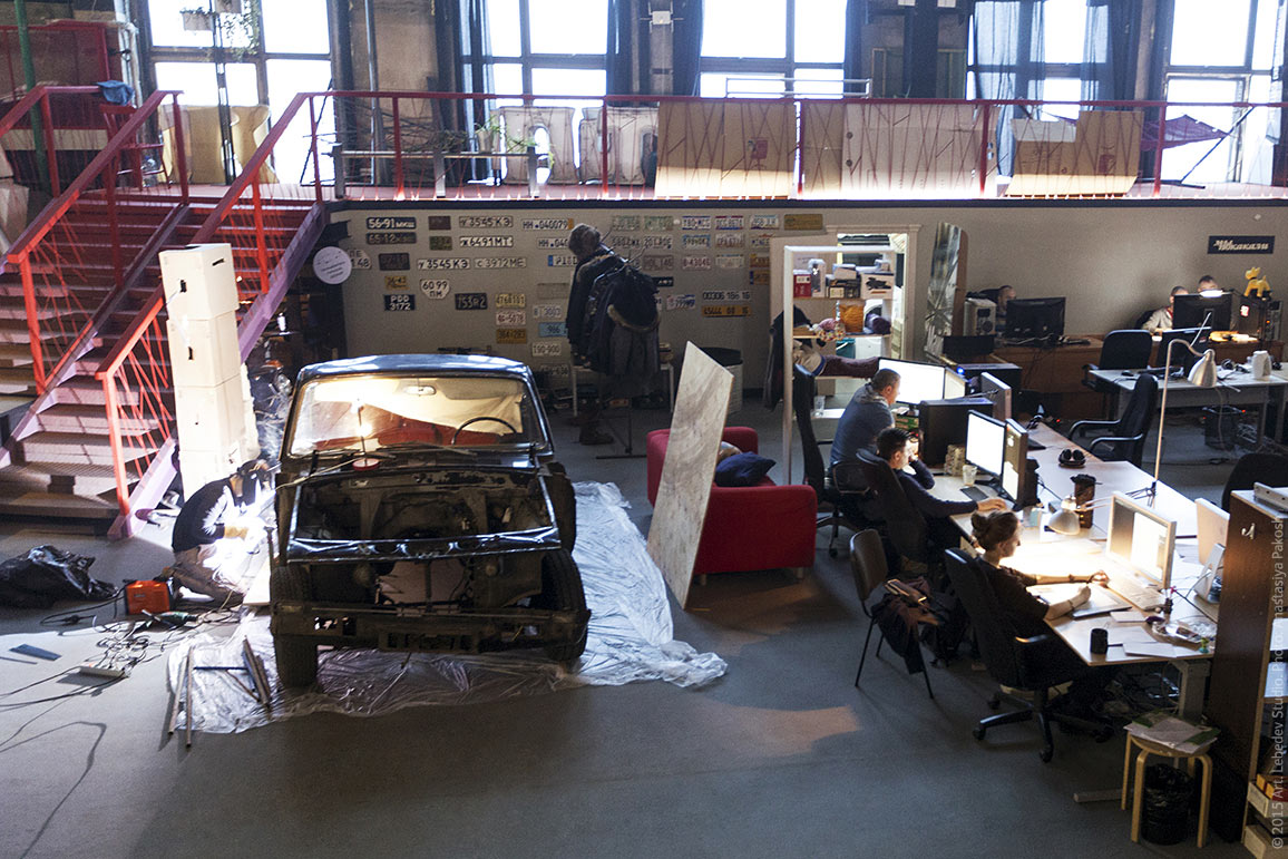 Engineer David Gabiskiriya welds the Volga body on the sixth floor of the studio.