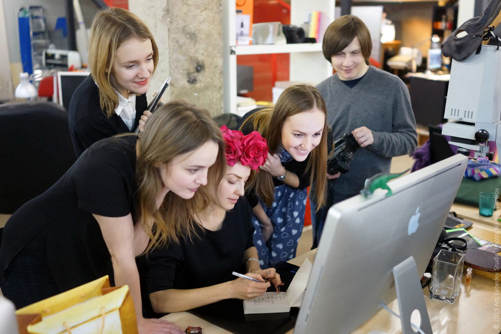 ![]() Left to right: head of the Graphic Design department Yevgenia Ezhikova, manager Olga Kallaur, photographer Yevgenia Filatova, manager Svetlana Kost and photographer Denis Vidyakin go through photographs after a photo shoot.