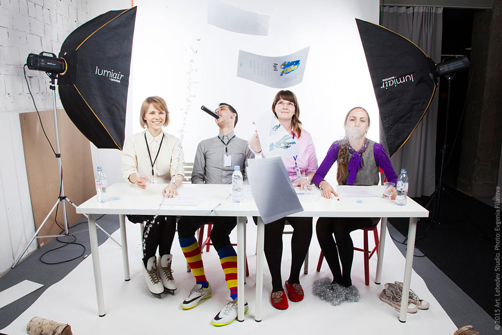 ![]() Left to right: photographer Anastasia Pakosh, designer Sergei Nikolayev, typesetter Anna Golovina and manager Svetlana Kost at a photo shoot for Saint Petersburg corporate identity.
