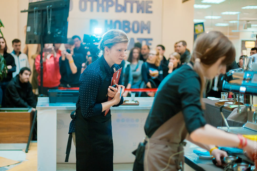![]() Krasnodar: chef-barista Nastya Nikitina (center) peforms the duties of a technical judge at the Kubok Yuga barista championship qualifier.