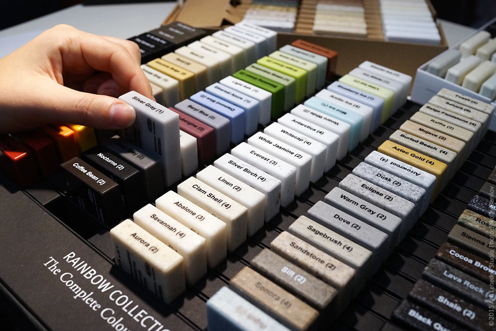 Head of industrial design department Larisa Melnikova selects artificial stone samples for a studio project.