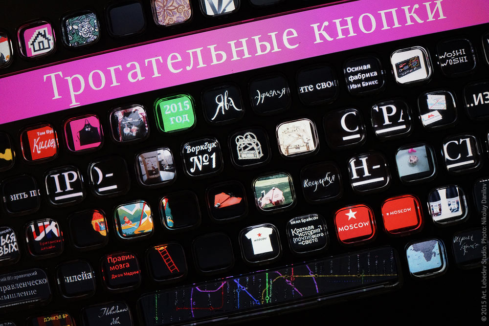 Art. Lebedev Studio Store on Bankovsky got its own information stand based on the Optimus Popularis keyboard: visitors can push a button to read about the corresponding studio project on a big screen.