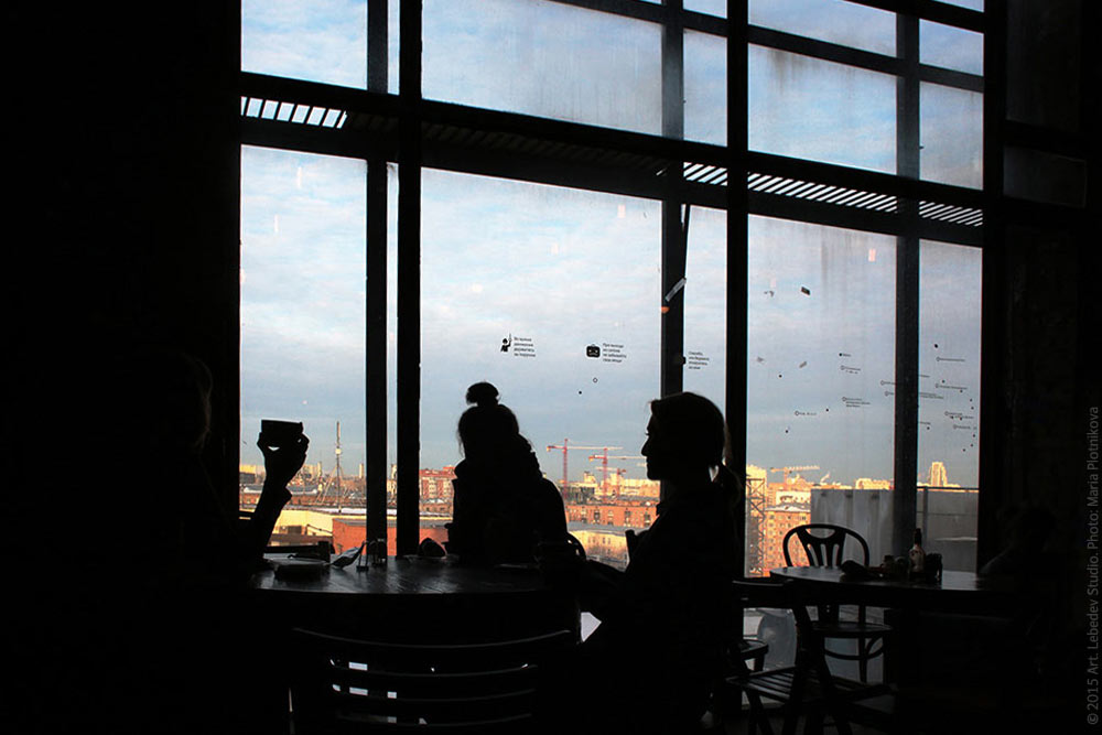 ![]() Type designer Taisiya Lushenko, head of production department Anastasia Prishchepa and photographer Yevgenia Filatova chat in the café on the seventh floor of the studio.