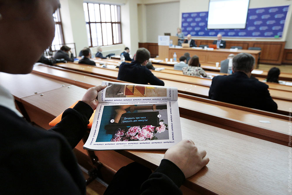 ![]() A participant of the Moscow Economic Forum reads a fresh issue of Afisha magazine with a story on Verbarius digital clock.