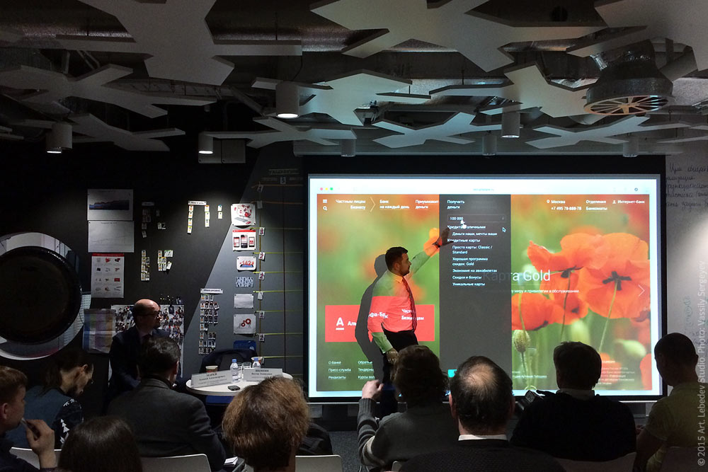 ![]() Press conference in the Alfa Laboratory innovation center: Alfa Bank marketing director Viktor Shkipin introduces the new website of the bank.