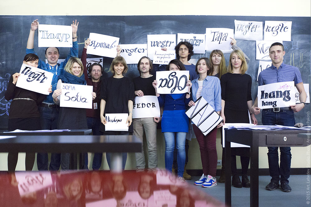 ![]() A typeface workshop took place at the studio. Pictured (left to right): typesetter Anna Olshevskaya, art director Timur Burbayev, designer Sofia Solomko, typesetter Yaroslav Bondarenko, photographer Anastasia Pakosh, designer Fedor Fokin, designer Olga Konovalova, designer Ivan Tikhomirov, typesetter Nadezhda Efremova, type designer Taisiya Lushenko, type designer Ksenia Yerulevich and designer Dmitry Lamonov with their assignments; the task was to write their name or a favorite word. |