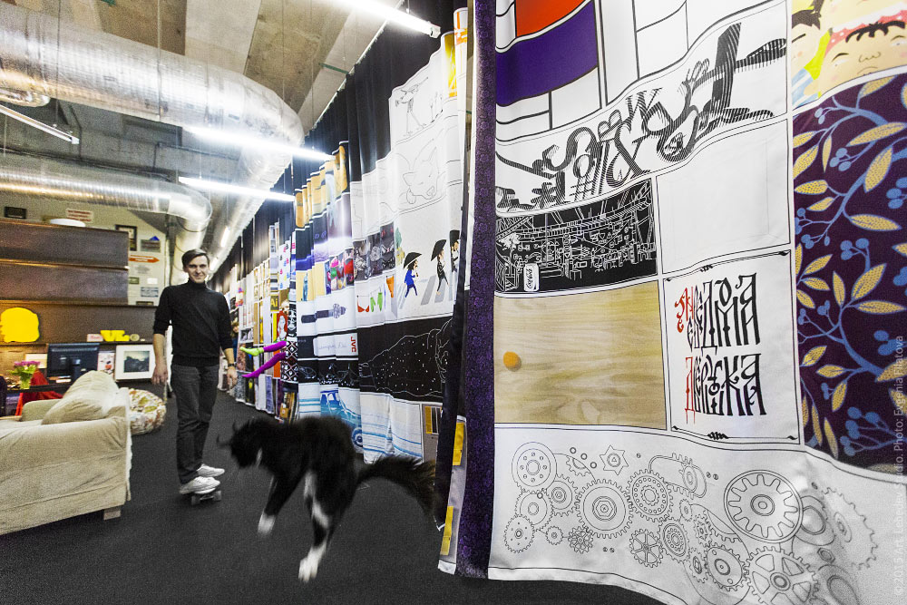 ![]() The graphic design department is now separated by a 20-meter curtain with works of the studio’s illustrators, designers and photographers. Pictured: typesetter Andrey Ushnurtsev and Bart the cat.