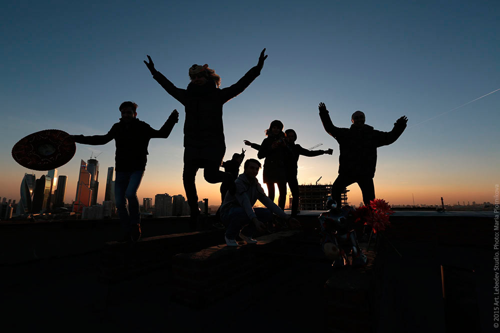 Left to right: visualizer Viktor Lvov, designers Sofia Solomko, Alexander Blagov, Boris Tarasov, manager Ekaterina Filimonova, designer Andrey Fabishevsky and art director Timur Burbayev have their pictures taken on on eof the Moscow roofs.