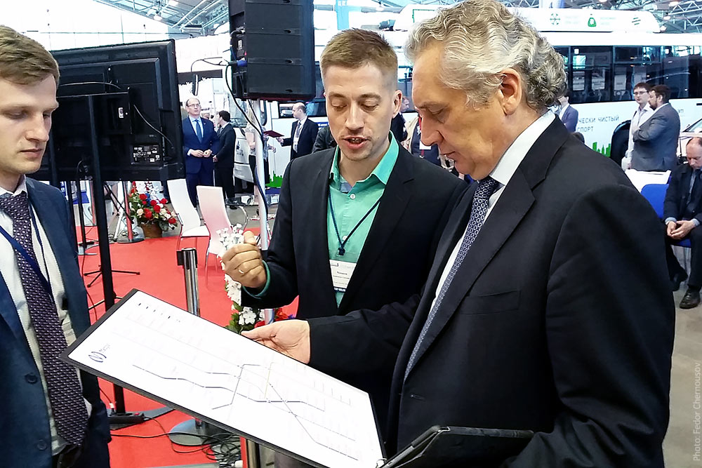 ![]() Saint Petersburg International Innovation Passenger Transport Forum: studio’s project manager Alexander Minakov (center) demonstrates the Saint Petersburg Metro map to the chairman of the Transport Committee of Saint Petersburg Alexander Vorobiev.