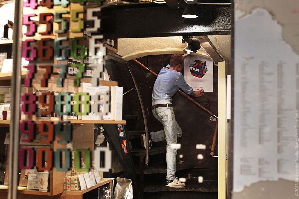 Sales assistant Egor Gorshkov decorates the studio’s Store and Café on Bolshaya Nikitskaya with the Russia Day poster.